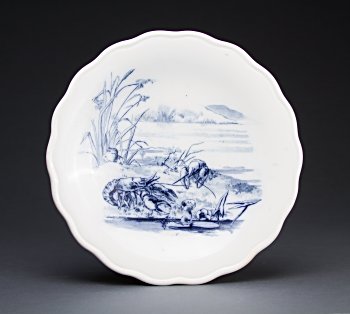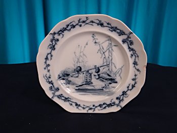There is a chip at about 9 o'clock along the scalloped edge of this lovely plate. The design, showing the moment just before lift-off, is repeated elsewhere in Brown-Westhead, Moore and Company productions. The design spills over nicely into the ridge connecting the center of this plate with its rim.