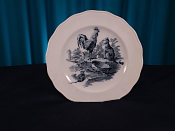 1890? A cream-colored plate over 9" in diameter with a 6" black-and-white circular design at its center presenting "The Mouse, the Rooster, and the Cat." The back of the plate shows a number of registry marks, the clearest an ink stamp working down from a crown through a circle surrounding a coat of arms with "BWM & Co" across it and "Fables" underneath it. Other marks include an indented sign surrounding a large "R" and an indented name, apparently Brown-Westhead. Well repaired edge from about 2:00 to 4:00. Hanley, Staffordshire: Brown-Westhead, Moore and Company (in existence from 1861 to 1904). $35 from Mary Ellen Kennedy, Larchmont, NY through Ebay, Dec., '99.