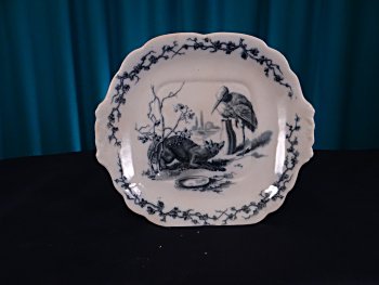 1880? A white-colored platter 10½" x almost 9½". Inside of a surrounding pattern of branches and grapes on the platter's ledge is an image featuring a fox and a stork. The back of the platter shows two simple registry marks and an indented name, apparently Brown-Westhead, Moore and Company (in existence from 1861 to 1904). The "Moore" portion is indistinct. $50 from Shirley Perry, May, '00.