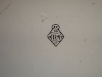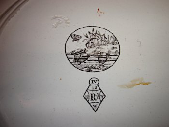 Here are four plates and one cake pedestal, all acquired separately, that bear the clear stamp of coming from the same manufacturer. In fact, the manufacturer has several clear symbols on the back of his work. Still, the manufacturer's identity escapes me. The common theme is that "the" is transformed here into "ye" on three of the five pieces. The cake pedestal has a date inscribed on a sticker on its base: "1879" and I take that as a first clue. One seller identified his plate as "Copeland" and I take that as my second clue. I look forward to identifying the manufacturer better with the help of the seals on the bottom of the three items, and so I produce them here.