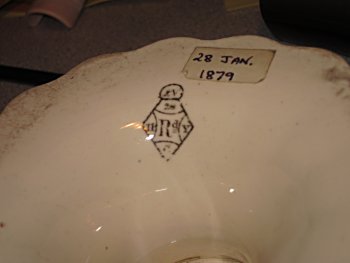 This is a lovely piece of work. The black crow stands out in the center of the plate with a stone in his beak. Next to him is a red flower atop a green stem. The crow is perched on a red and brown surface and is ready to drop the stone into a gray vase. "Ye Crow and Ye Pitcher" runs from 12 o'clock to 4 o'clock. The base has an attached label: "28 Jan. 1879." The "Rd" of the trademark is here surrounded, clockwise from the top, by 28, Y, C(?), and 11, with IV over the whole mark. Very nice color work here!