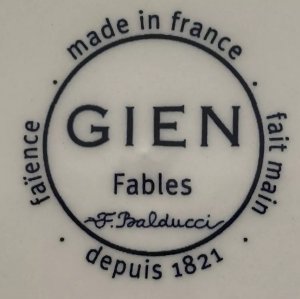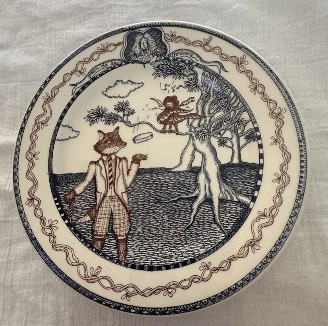 2000? Gien Fables Salad Plate. Fox and Crow. Faience. Fait main. Made in France. F. Balducci. 8.5". $40 from kara_kat through Ebay, March, '25.