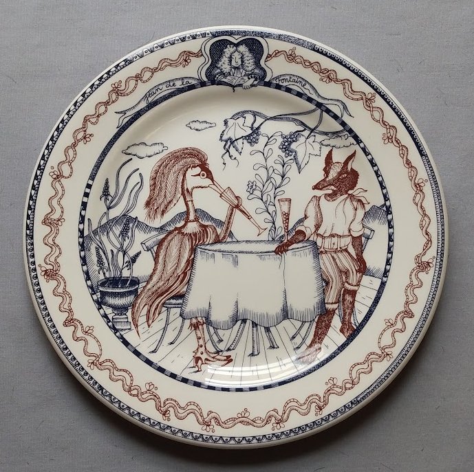 2000? Gien Fables Dessert or Salad Plate. Fox and Stork. Faience. Fait main. Made in France. Unknown source.