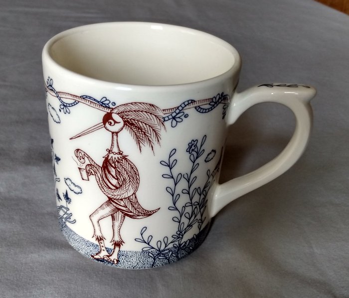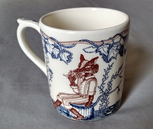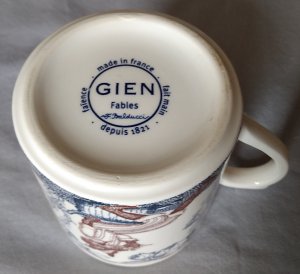 2000? Gien Fables Mug Fox And Stork. Faience. Fait main. Made in France. $35 from jdwyl0 through Ebay, Oct., '21.
