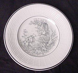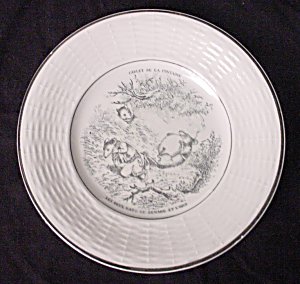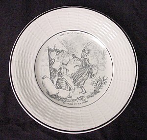| 1930? 7" white plate from Sarreguemines, France. Inside a 1.5" rim there is a portrayal of "The Fox and the Cat." The front carries two inscriptions: "Fables de la Fontaine" and "Le Chat et le Renard." The back has, in sketchy form, "Fables de la Fontaine" and "Digoin/Sarreguemines/France." $23.49 from Lea Belew, Beeville, TX, through Ebay, Oct., '00.