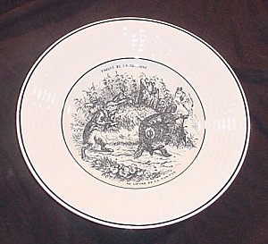 | 1930? 7" white plate from Sarreguemines, France. Inside a 1.5" rim there is a rendition of J.J. Grandville's "Le Chien Qui Porte a Son Cou le Diner de Son Maitre." The front carries two inscriptions: "Fables de la Fontaine" and the title. The back has "Fables de la Fontaine" and "Digoin, Sarreguemines, France." $23 from Mary Ellen Kennedy, Larchmont, NY, Feb., '00. One extra exemplar.