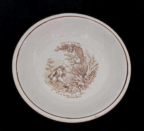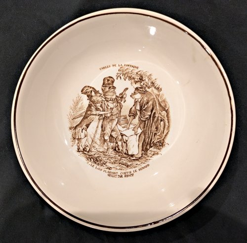 1930? 7¼" white bowl from Sarreguemines, France. 1.5" deep. Inside the bowl there is a brown adaptation of Grandville's "The Cat and the Fox." The front carries two inscriptions: "Fables de la Fontaine" and "1. Le Chat et le Renard." The back has the usual Digoin stamp. From an unknown source before 2006.