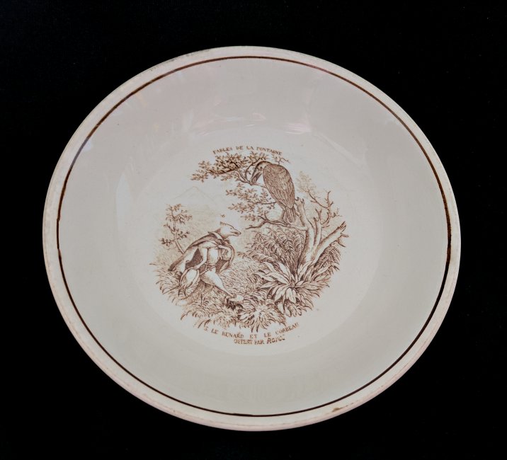1930? 7¼" white bowl from Sarreguemines, France. 1.5" deep. Inside the bowl there is a brown presentation of FC. The front carries three inscriptions: "Fables de la Fontaine," "Le Renard et le Corbeau," and “Offert par Royce.” The back has the usual Digoin stamp. From an unknown source. In this case the series moves away from Grandville to Royce. Renard admires below with his hat in hand. Was Royce an adapter of Grandville's work?