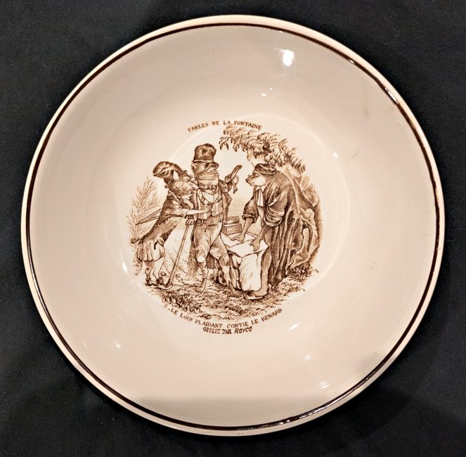 1930? 7¼" white bowl from Sarreguemines, France. 1.5" deep. Inside the bowl there is a brown adaptation of Grandville's "The Wolf Pleading against the Fox." The front carries two inscriptions: "Fables de la Fontaine" and "8. Le Loup Plaidant contre le Renard." The back has the usual Digoin stamp. From an unknown source. The two characters are again in an outdoor setting but still clearly a court trial. Each raises a paw pleading innocence before the monkey judge. Hats, vests, and trousers again humanize both. The monkey is smart enough to know that there is wrongdoing on both sides. | |