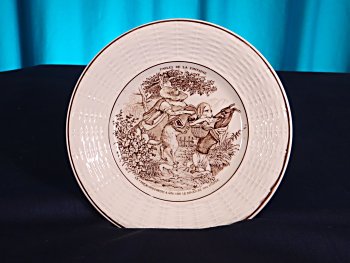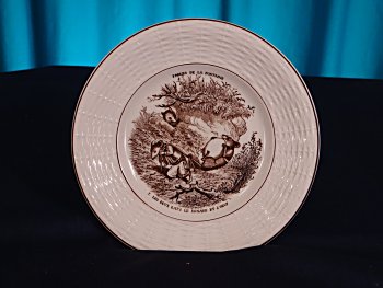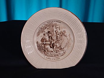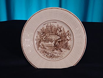 1930? 7" white plate from Sarreguemines, France. Inside a 1.5" rim there is a representation of Grandville's "The Wolf Pleading Against the Fox." The front carries two inscriptions: "Fables de la Fontaine" and "8. Le Loup Plaidant Contre le Renard." The back has a smudged partial stamp. $5 from pjhmah through Ebay, April, '04.
