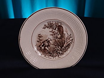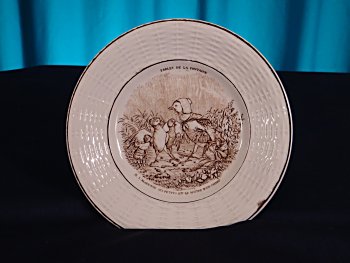 1930? 7" white plate from Sarreguemines, France. Inside a 1.5" rim there is a representation of Grandville's "Lark, Her Children, and the Master of the Field." The front carries two inscriptions: "Fables de la Fontaine" and "11. L'Alouette, les Petits et le Maitre d'un Champ." The back has an indistinct "Digoin" stamp.