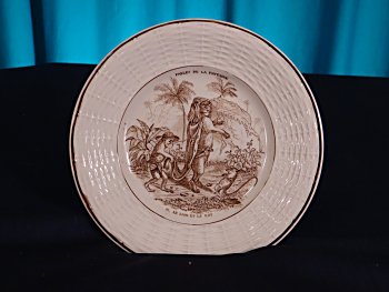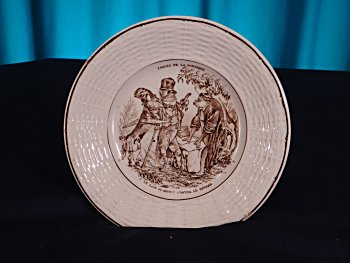 1930? 7" white plate from Sarreguemines, France. Inside a 1.5" rim there is a portrayal of FC (X 2). The front carries two inscriptions: "Fables de la Fontaine" and "3. Le Renard et le Corbeau." The back has a smudged "Digoin" stamp. $9 from Take a Second Look, Inc., Cuddebackville, NY, through Ebay, June, '99.