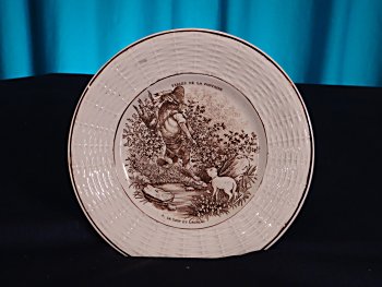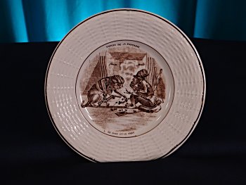 1930? 7" white plate from Sarreguemines, France. Inside a 1.5" rim there is a representation of Grandville's "The Dog Carrying His Master's Dinner." The front carries two inscriptions: "Fables de la Fontaine" and "10. Le Chien Qui Porte a Son Cou le Diner de Son Maitre." The back has a "Digoin" stamp.