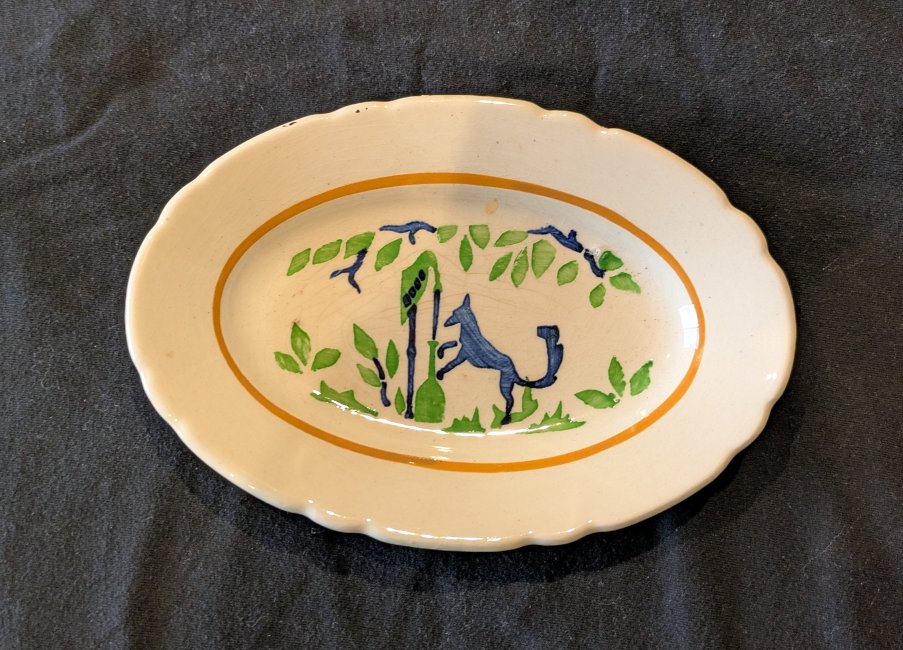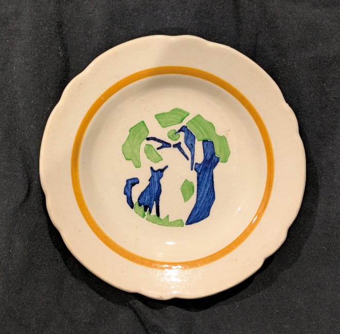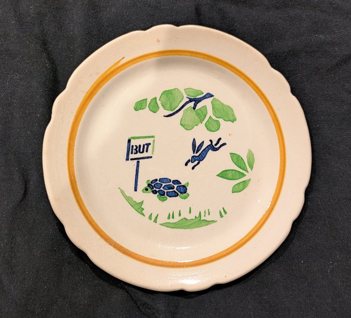 1925? Two cream-colored small plates 5" in diameter with 2½" green-and-blue stencilled figures of FS and FC at the center. Around the central picture runs a yellow band. Most likely made by Montereau or Choisy-le-Roi. The theme of this tea-service set for children or "service de poupée" was, no doubt, the fables of La Fontaine. $20.50 from Mary Ellen Kennedy, Larchmont, NY through Ebay, Nov., '99.