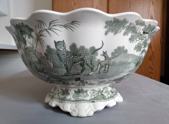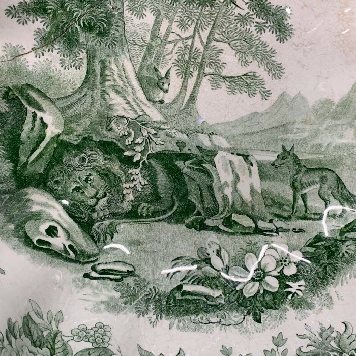 I agree with the seller that this large bowl is crisply transfer printed in the best green color. It features oversized flowers with hidden fox heads. The center has the fox wary of the supposedly sick lion. The outside has a repeated scene of the leopard bragging about his beautiful skin and the fox answering in terms of the beauty of his mind. As the seller noted, a large piece had been reapplied with glue and staples, one of only a few that probably still survive. "We rarely add a damaged piece to our shop unless it’s worthy of merit." I agree with that too!