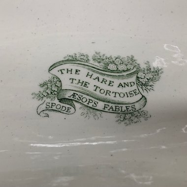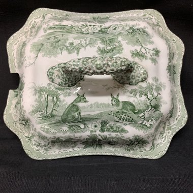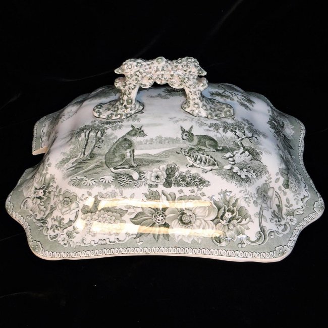 1835 Spode large soup tureen lid featuring TH. Staffordshire green transferware. Copeland and Garrett -- New Blanche Potteries. 11" long x 9" wide x 4¾" tall. $150 from AestheticAntiques.com, Oct., '22.