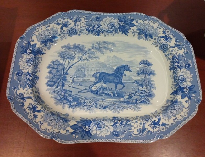 It took research on the web for me to realize that this is a dog bowl – that is, not only illustrating a dog but meant for feeding a dog! A copy is on sale online for $275. Though this is recent, it is rare, unusual, and valuable. The DS scene on the bowl appears on another Spode piece in our collection, a reproduction platter.