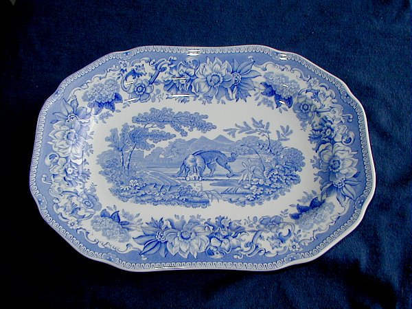 Apparently Spode has begun a nostalgia replica series recently. It surprises me how suddenly these related items have sprung up on Ebay. One of the blue plates is still in its styrofoam casing. I think I lost track, in the midst of my summer travels, on whether I had already landed a blue plate. I am not really seeking a full service for eight! For me the most appealing piece visually is the platter. The dog clutches his bone but is right down at water level and ready to pounce!