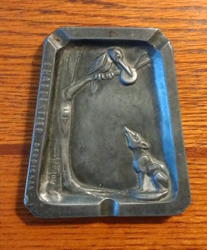 The stork eats and drinks while the fox can only look into his long, tall glass. The legend underneath the scene reads "Buchecker a pour chaque vin son verre. La cigogne n'en a pas pour le renard!" "Buchecker has for every wine its own glass. The stork did not have the right one for the fox!" I take it that Buchecker is a glass-supplier for wine bars. Their description on the back says that the produce glass, porcelain, and crystal for restaurants, hotels, and bars. What a lovely little bit of Aesop to show up on a bar counter!