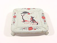 There is even a strainer to hang on the wall rack. The set, with a grey background, features three motifs in red-and-black coloring:
