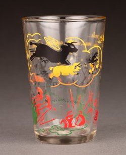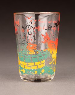 The yellow of the mustard would have brought out the color of at least most of these jars. Amora pushed this series, following up with blotters and dust jackets. Click on each glass to see three views of it.