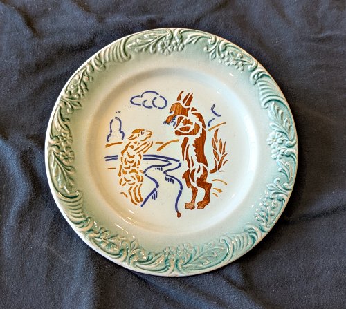 1920? Twelve plates -- including three extras -- illustrating fables of La Fontaine. 7½" white plate bordered in a green floral pattern with a central design in two or three of four colors: green, blue, brown, and tan. The back gives the fable title in block letters along with an FNG symbol surrounded by "Faïencerie Nouvelle, Givors, France." $10 to $15 each from a variety of sellers including Mary Ellen Kennedy, Larchmont, NY through Ebay, Nov.,' 99 and April, '00. WL from an unknown source.