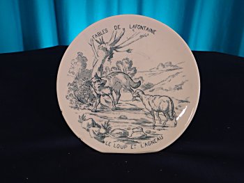 1920? 8½" cream-colored plate with a blue-green colored design depicting WL. The plate reads "Fables de LaFontaine" and "Le Loup et l'Agneau." The smudged back stamp reads "Porcelaine opaque de Gien." $25 through an unknown source prior to 2007.