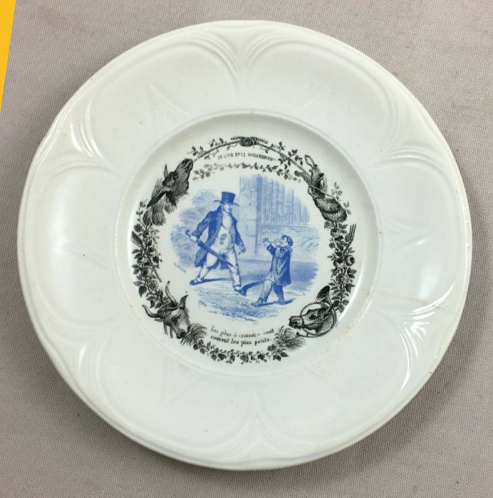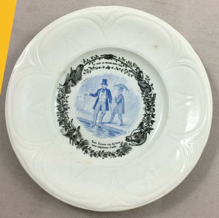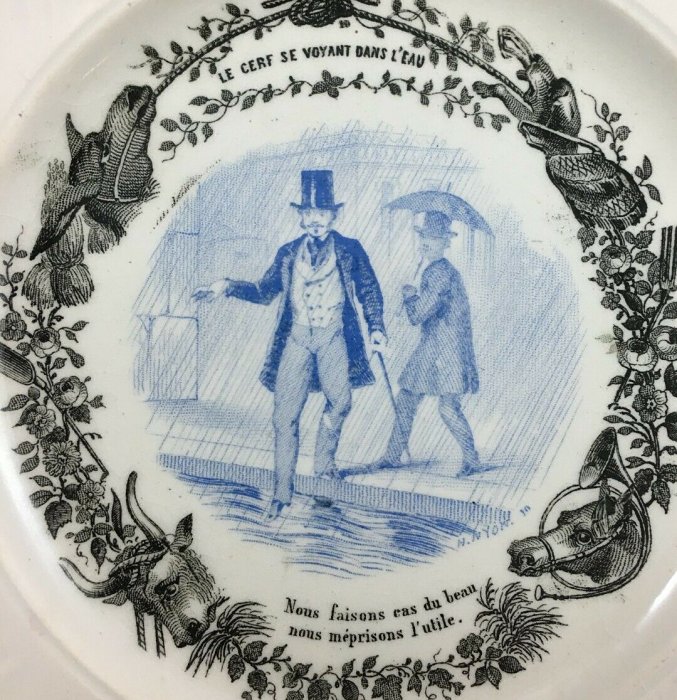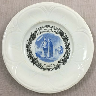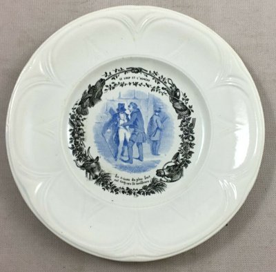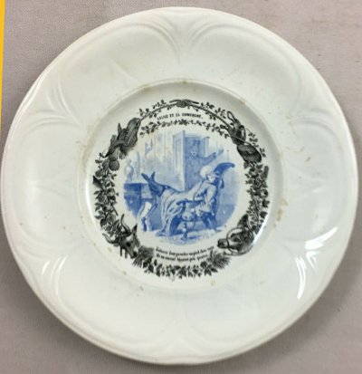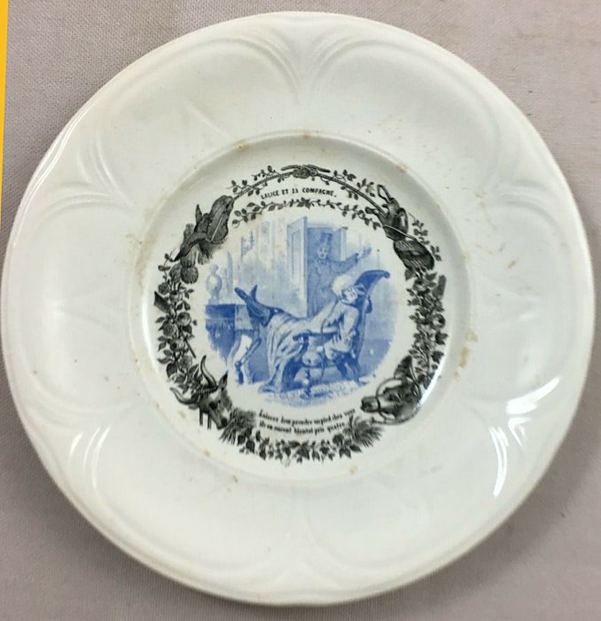 1910? Seven "talking plates" by Hautin Boulenger & Cie, in Choisy-le-Roi, France, featuring illustrations of fables of La Fontaine. 7¾" in diameter. €8 each from Jobey Antique Shop, Normandie, France, through Ebay, Oct., '20. Four further plates from artdelatable50 through Ebay for €46, Jan., '22.
