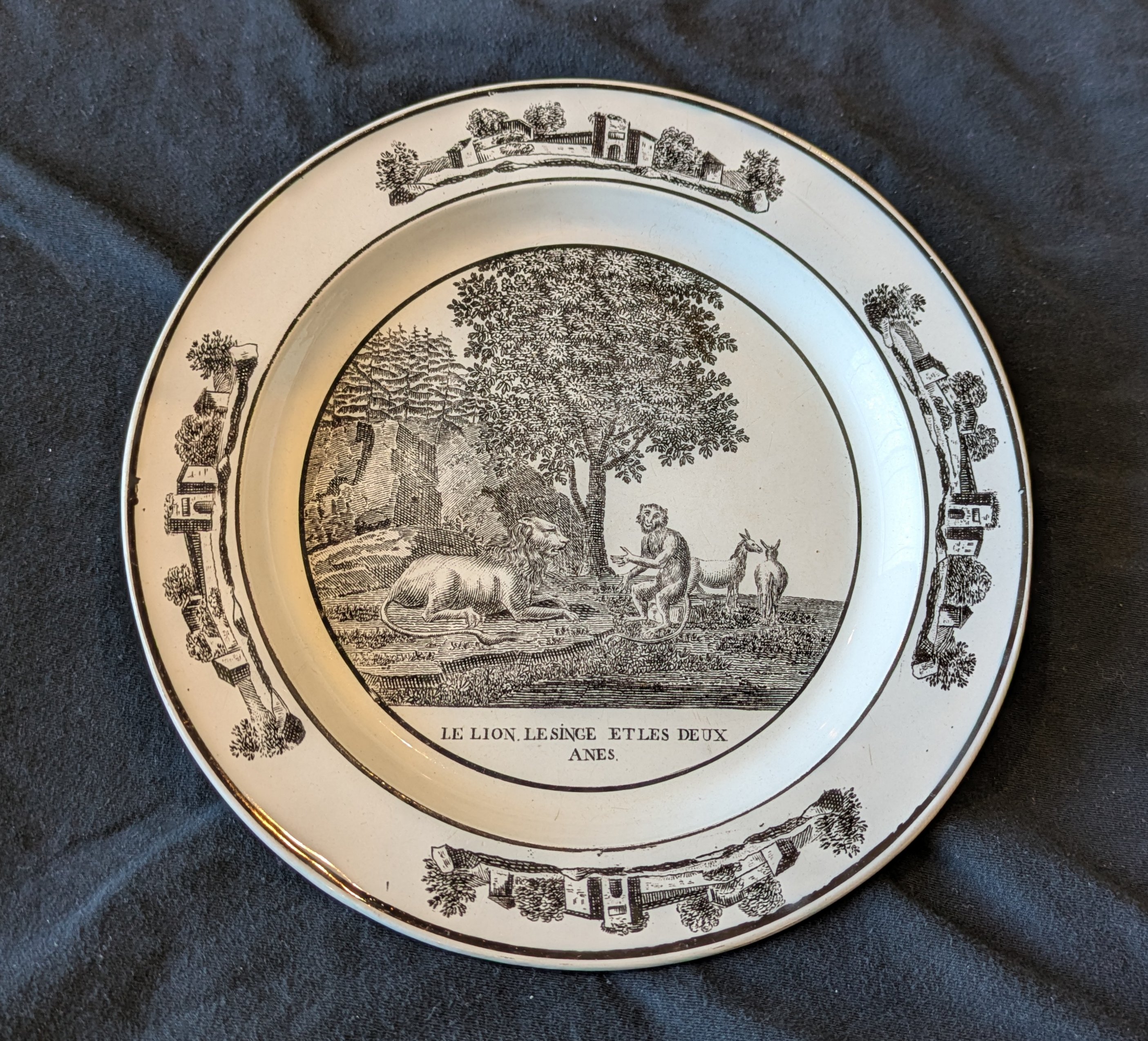 1810? Three “talking plates,” most probably by Montereau. “The Lion, the Monkey, and Two Asses “; “The Shepherd and the Sea”; and “The Oyster and the Litigants.” 8.5” diameter. Earthenware, creamware, with transfer designs. Unknown source.