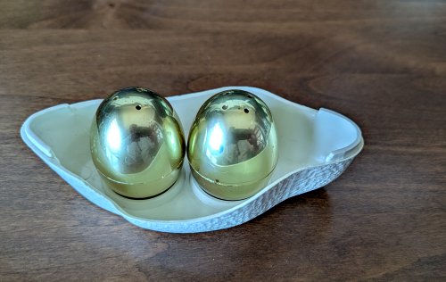 1960? Goose and Golden Egg salt and pepper shaker set. Made in Japan. The goose is almost 1½" x 2¾" x almost 2¾" high with three holes at the base of her neck. The egg is almost 1 1/8" high and wide and 1½" long with three holes on the rounded side. $5.50 from Guy Berard, Canton, NY, through Ebay, Feb., '01.