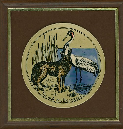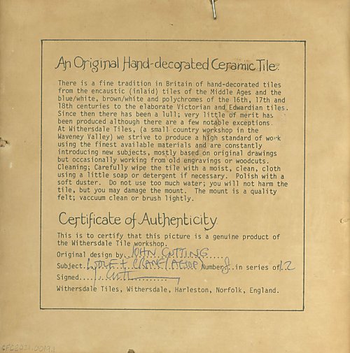1950? Circular Withersdale Ceramic Tile of WC. John Cutting. Number 8 in a series of 12. With certificate of authenticity on the verso. Tile is 6" in diameter, frame 9.5". Unknown source and date of acquisition.