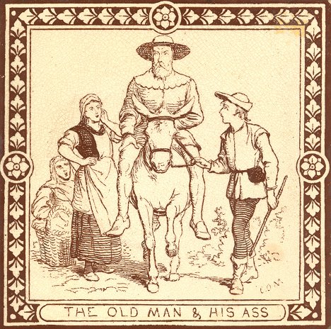 These tiles are done in a brown-and-white format. I have not yet succeeded in identifying the artist but the images seem so familiar! Each tile is signed "COM." So far I have three tiles in a series reported to include twelve tiles. The miller in MSA is so serious! For me the greatest interest in GGE lies in the surprise on the woman's face as she looks on."The Doctors" is a rather unusual fable to illustrate but absolutely true to experience, not just in medicine!