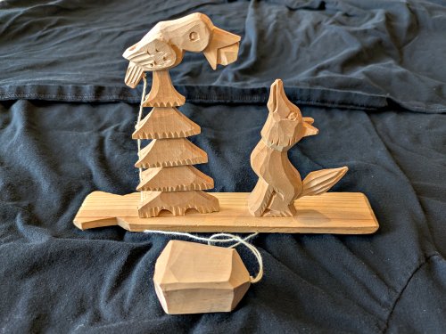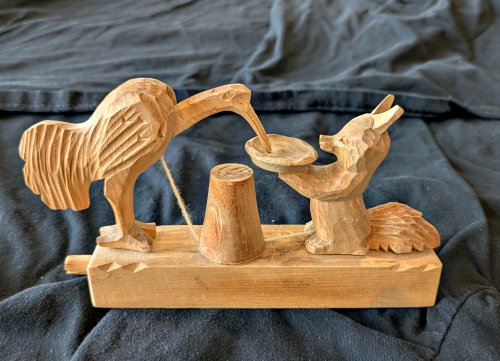 This is one of the most successful of Russia’s lovely active carved wooden toys, and it portrays a fable I wish were presented more often. Good operating condition!
