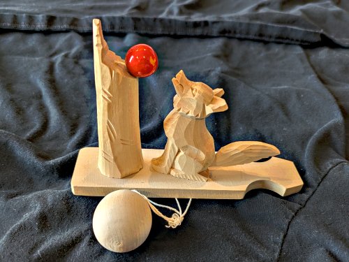 Get the ball going in a circular movement, and the fox will wag his tail. The "grape" may actually be an apple or a cherry! Ingenious and well executed.