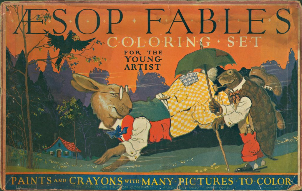 1940? Separated cover of “Aesop Fables Coloring Set for the Young Artist.” Paints and Crayons with Many Pictures to Color. Apparently produced by the American Crayon Company of Sandusky, Ohio. Measurements. Unknown source.