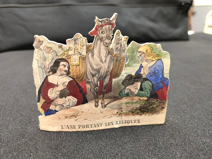 1900? Litho-Cardboard with Wooden Stand: "Ass Carrying Relics." 4.5" wide, 3.5" tall. €10 from Thierry Corcelle, Paris, July, '23.
