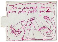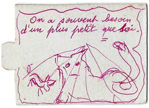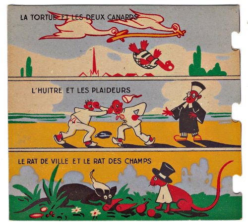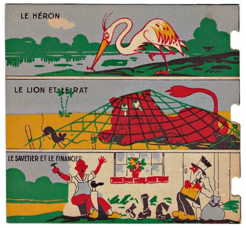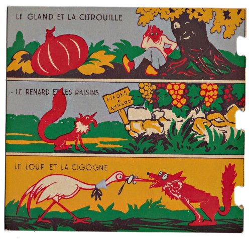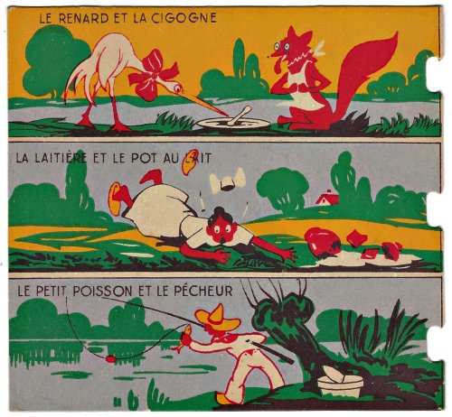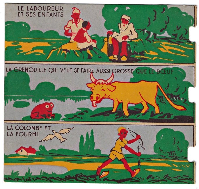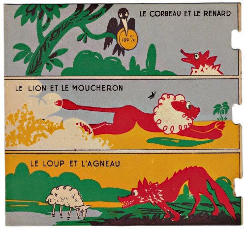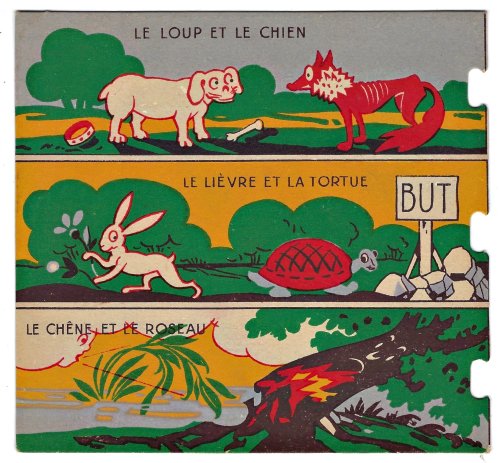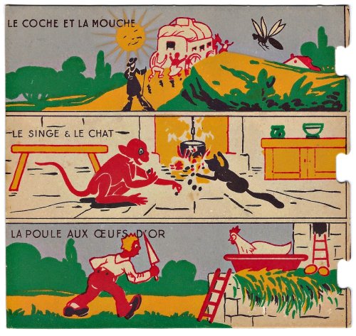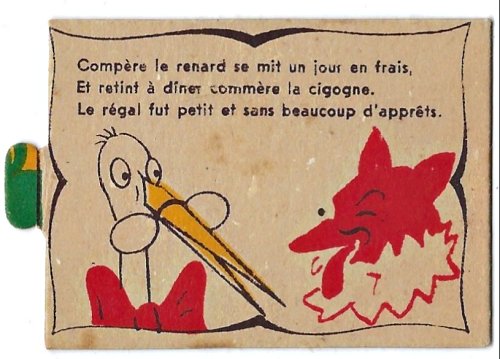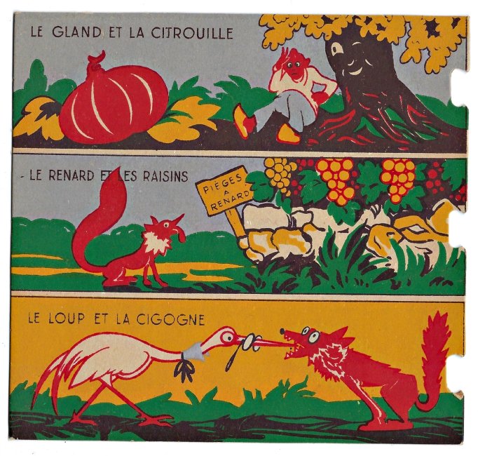 I played this game and it is really fun! The little cards present each several lines from a fable of La Fontaine. The challenge then is to connect this saying with the fable to which it belongs. I had to set aside a few until I came to the end! There is a confirming clue in the match of the tab of the little piece: it matches the picture it belongs to. One missing piece has been reconstructed, I believe, by a beleaguered parent whose child lamented that one piece was missing!