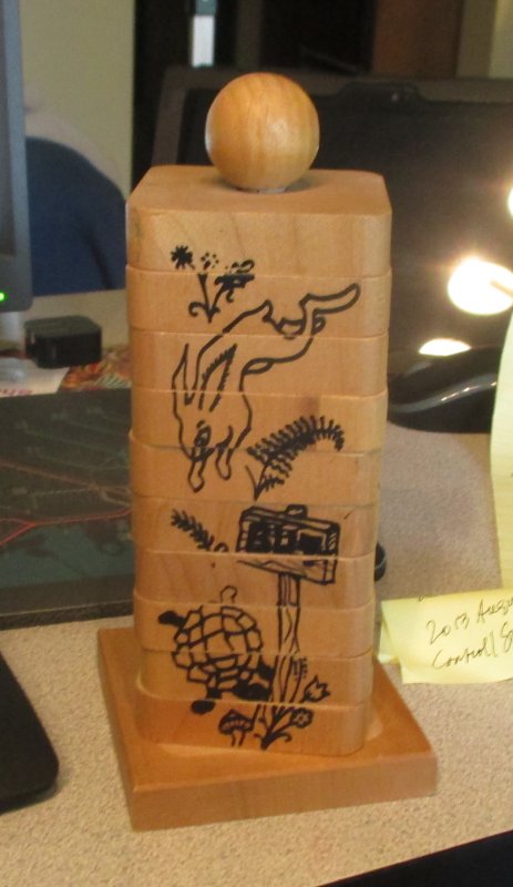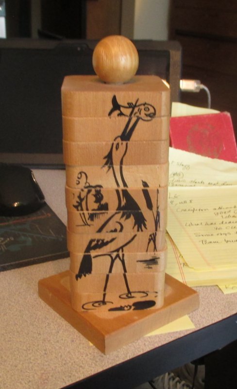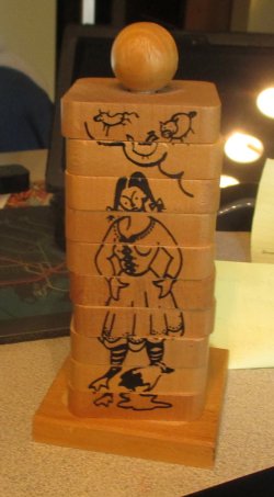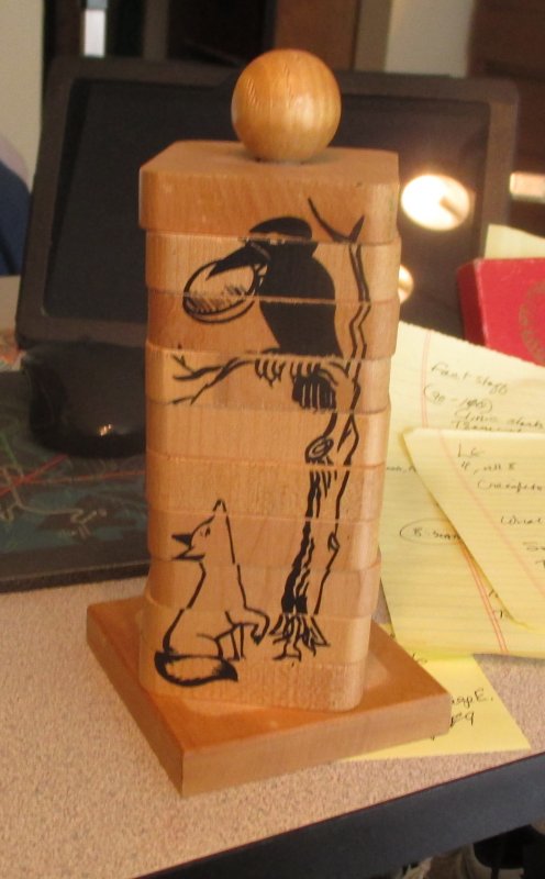 1980? French wooden puzzle and stacking toy based on Aesop's fables. One fable image on each of the four sides: MM; "The Heron"; FC; and TH. 8" high and 3½" square. $36.89 from FrenchVintageBibelot through Etsy, Dec., '20.