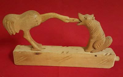 This is one of the most successful of Russia’s lovely active carved wooden toys, and it portrays a fable I wish were presented more often. Good operating condition!
