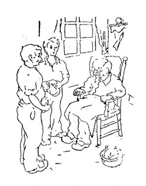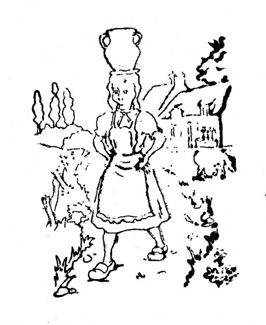The rubber side of the stamp shows the image more clearly than the stamped version, worn perhaps from use. One can see clearly the chickens, pig, and cow that the milkmaid dreamed of along the way to the market. See also the "Thank You" stamp under "Household."