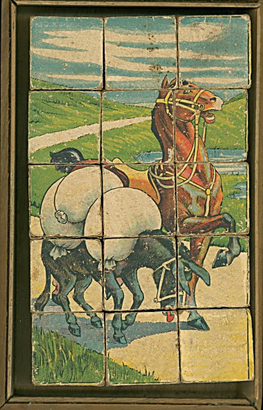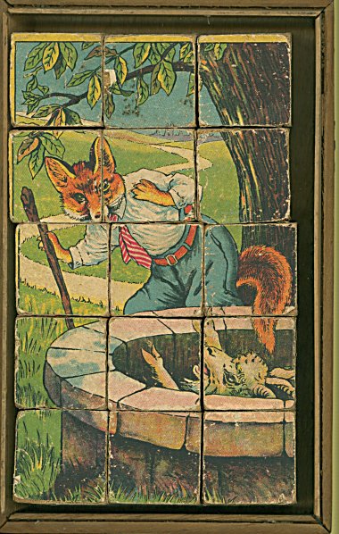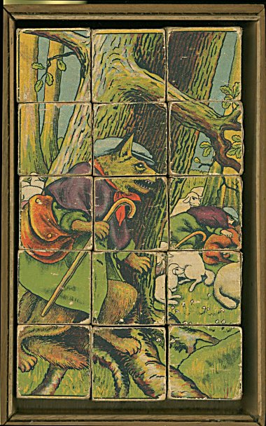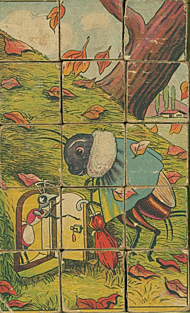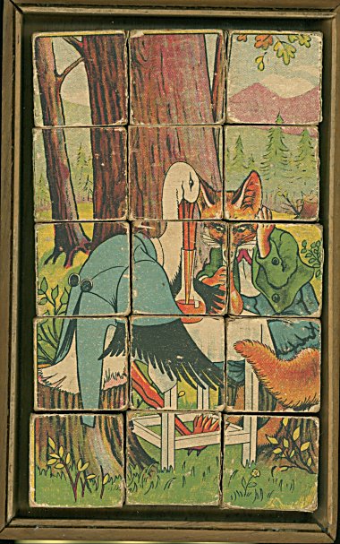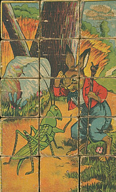 1920? Set of 15 six-sided picture cubes illustrating fables. Slightly larger than 1½" on each cube's side. In the original box? "Wolf in Shepherd's Clothing"; "Horse and Mule"; "The Fox and the Goat"; GA, FS; and an image involving a grasshopper and a rabbit. €35 from choupette-fr through Ebay, March, '24.