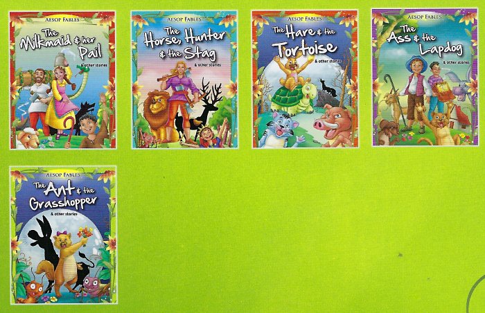 Here is a curiosity. In 2010 I bought a carton of five large pamphlets, apparently accompanied by a CD, of Aesop's fables produced in India and sold to me by a company in Australia. This year, listening finally to the CD, I wondered if there were booklets to go with it. The left hand did not know what the right hand had done! I went online and found the set of five booklets, sold to me this time by Books Puddle in New York through ABE books in England! As I finally catch up to what happened, I notice some differences in the carton and the individual booklets. The carton is much the same, but the Pegasus emblem has changed. The price marked on the bottom of the carton has risen from $18.50 to $19.95. I believe I found the date of the set bought earlier only by going online to see when the set was listed as published. Several things have changed in the booklets, too. The format of the bibliographical information on the inside front cover has changed slightly. Gone is "1st Impression" from the earlier group. Mention of J.J. Offset Printers is gone. The back covers no longer mention Pegasus' promise to give a book for every ten books bought. Instead the back cover advertises "101 exciting storybooks!" The individual copies now state a price of 60 Rupees. Instead of the 10 to 1 offer on the bottom of the back cover, one finds now one of three cartoons. One has a mouse holding a sign in front of a lion "What is the value of moral values?" Things undergo curious changes! I am guessing at a date of 2015 for the later publication. By now in 2021, the series seems to have been discontinued.