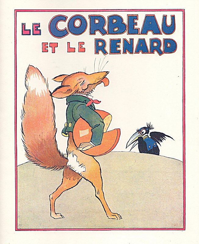 2012 Le Corbeau et le Renard. Jean de La Fontaine. Félix Lorioux. Paperbound. Berkeley, CA: Calligraphics. $5 from Paul Veres, Berkeley, CA, June, '15. Here is Paul Veres' excellent facsimile of Lorioux' original work from 1921. The colors are crisp. After all, it is the colors that attracted Paul in the first place. The cover and the last image strike me as the best here, for they are full of emotion: the pride of the fox marching away with his cheese and the chagrin of the weeping cros. The title-page comes from Lorioux' entire volume. The back cover reproduces Lorioux' delightful front cover showing La Fontaine sitting between two young children and, with quill in hand, reading his own fables to them. Two mice run away. The inside back-cover includes a picture of Lorioux and cites his edition of 1929. Eight pages. | |