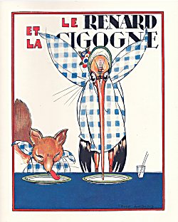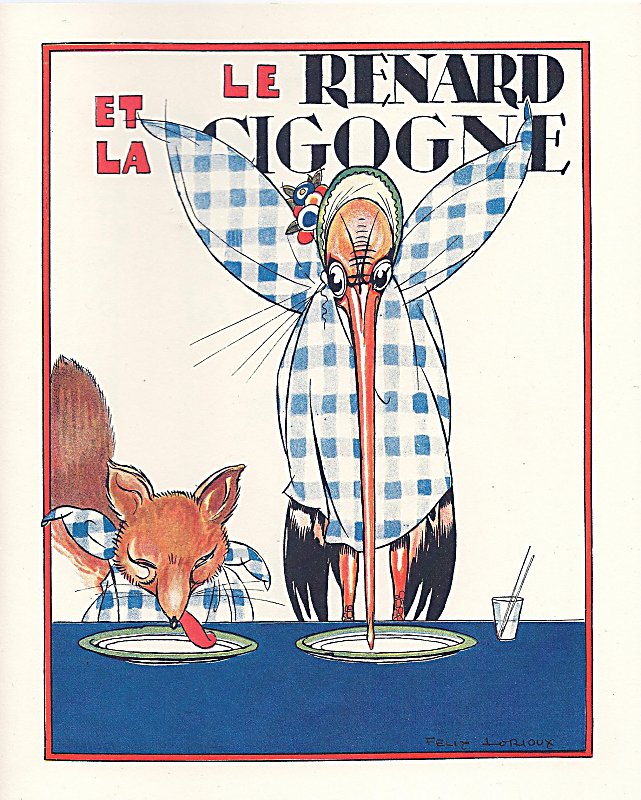 2012 Le Renard et la Cigogne. Jean de La Fontaine. Félix Lorioux. Paperbound. Berkeley, CA: Calligraphics. $5 from Paul Veres, Berkeley, CA, June, '15. Here is Paul Veres' excellent facsimile of Lorioux' original work from 1921. The colors are crisp. After all, it is the colors that attracted Paul in the first place. A viewer looking at the cover of this pamphlet has to be drawn to the long vertical line of the stork's bill at the moment of frustration at the fox's dinner. The fox's bright red curvaceous tongue makes a lovely contrast. That long line returns in the two payback pictures, third-to-last and second-to-last in Lorioux' series. The artist also pays close attention to the dress of the two characters, including the fox's top hat, glasses, and spats. Little animals frolic in the outdoor scenes, while a dead chicken hangs in the fox's lair with a note "to keep." The title-page comes from Lorioux' entire volume. The back cover reproduces Lorioux' delightful front cover showing La Fontaine sitting between two young children and, with quill in hand, reading his own fables to them. Two mice run away. The inside back-cover includes a picture of Lorioux and cites his edition of 1929. I notice now what seems true of all six copies: Hachette on the inside back-cover is called not a Librairie but a Librarie. Eight pages.