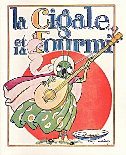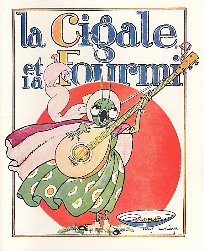 2012 La Cigale et la Fourmi. Jean de La Fontaine. Félix Lorioux. Paperbound. Berkeley, CA: Calligraphics. $5 from Paul Veres, Berkeley, CA, June, '15. Here is Paul Veres' excellent facsimile of Lorioux' original work from 1921. The colors are crisp. After all, it is the colors that attracted Paul in the first place. The cover and first two pictures cleverly allow the cicada's guitar to extend beyond the frame that Lorioux is careful to provide. Perhaps the most engaging image represents the moment of the ant's question "What were you doing all summer?" The French tradition typically made the ant into a stolid bourgeois mother standing at her house door with her children. Lorioux presents the ant rather as a cook in an apron busying herself with (confi?)ture boiling in a pot. Well done! The title-page comes from Lorioux' entire volume. The back cover reproduces Lorioux' delightful front cover showing La Fontaine sitting between two young children and, with quill in hand, reading his own fables to them. Two mice run away. The inside back-cover includes a picture of Lorioux and cites his edition of 1929. Eight pages. | |