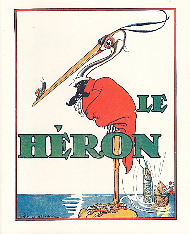 2012 Le Héron. Jean de La Fontaine. Félix Lorioux. Paperbound. Berkeley, CA: Calligraphics. $5 from Paul Veres, Berkeley, CA, June, '15. Here is Paul Veres' excellent facsimile of Lorioux' original work from 1921. The colors are crisp. After all, it is the colors that attracted Paul in the first place. The heron's sense of dignity is wonderfully presented here. Also well done are the various other fish and animals, some unmentioned by La Fontaine, like the butterflies which play around the inactive heron as he waits for the proper time. The title-page comes from Lorioux' entire volume. The back cover reproduces Lorioux' delightful front cover showing La Fontaine sitting between two young children and, with quill in hand, reading his own fables to them. Two mice run away. The inside back-cover includes a picture of Lorioux and cites his edition of 1929. I notice now what seems true of all six copies: Hachette on the inside back-cover is called not a Librairie but a Librarie. Eight pages.