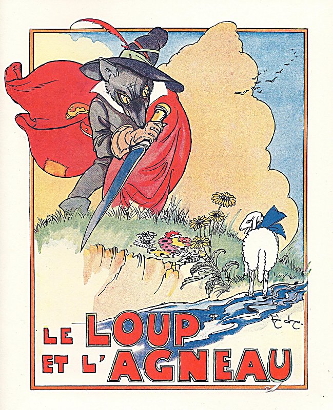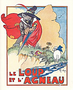 2012 Le Loup et l'Agneau. Jean de La Fontaine. Félix Lorioux. Paperbound. Berkeley, CA: Calligraphics. $5 from Paul Veres, Berkeley, CA, June, '15. Here is Paul Veres' excellent facsimile of Lorioux' original work from 1921. The colors are crisp. After all, it is the colors that attracted Paul in the first place. The cover illustration not only portrays the whole story in one glance. It hints at the story's visual foci: the wolf's sword and his eyes. The cover is also an excellent example of Lorioux' delightful colors. The visual storytelling here sets up nicely for the violent ending. In the preceding panel we see a bloody wolf impaled on a stake near the shepherd's fire and his dog. The title-page comes from Lorioux' entire volume. The back cover reproduces Lorioux' delightful front cover showing La Fontaine sitting between two young children and, with quill in hand, reading his own fables to them. Two mice run away. The inside back-cover includes a picture of Lorioux and cites his edition of 1929. I notice now what seems true of all six copies: Hachette on the inside back-cover is called not a Librairie but a Librarie. Eight pages. | |