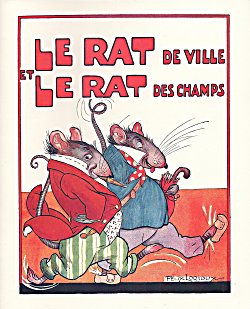 2012 Le Rat de Ville et le Rat des Champs. Jean de La Fontaine. Félix Lorioux. Paperbound. Berkeley, CA: Calligraphics. $5 from Paul Veres, Berkeley, CA, June, '15. Here is Paul Veres' excellent facsimile of Lorioux' original work from 1921. The colors are crisp. After all, it is the colors that attracted Paul in the first place. The cover may be one of Lorioux' most popular illustrations: the two rats march gingerly from left to right in contrasting clothing. Almost every illustration has some element -- a tail, a hat, a banana, a leaf -- that just escapes the ever-present picture frame. My favorite illustration fits the line "I will let you imagine the life of these two friends" at the city meal. The city rat flies through the air clinging to a half-peeled banana while his country cousin does a cartwheel on a banana peel. The following several pictures portray good moods: pleasant torpor, then panic, and then flight. Enjoy the contrasting shoes of the two rats and the cigar of the city rat. The title-page comes from Lorioux' entire volume. The back cover reproduces Lorioux' delightful front cover showing La Fontaine sitting between two young children and, with quill in hand, reading his own fables to them. Two mice run away. The inside back-cover includes a picture of Lorioux and cites his edition of 1929. I notice now what seems true of all six copies: Hachette on the inside back-cover is called not a Librairie but a Librarie. Eight pages. | |