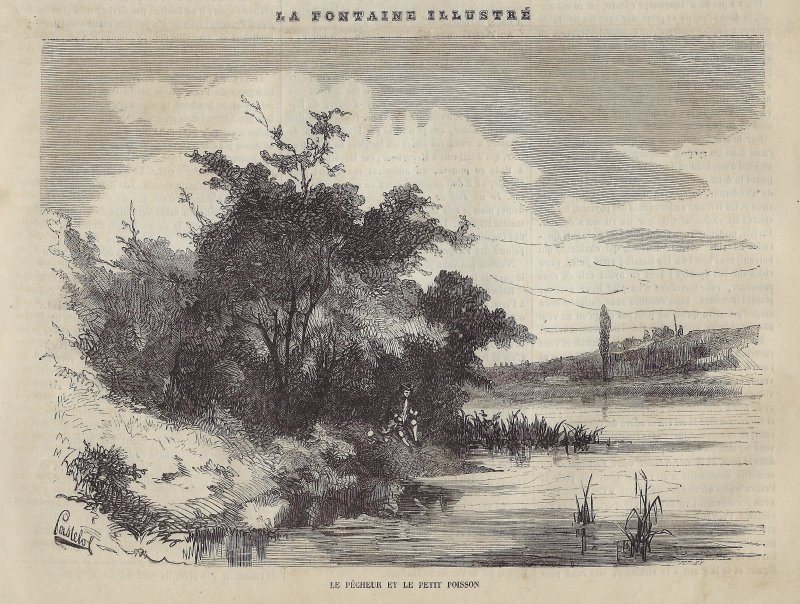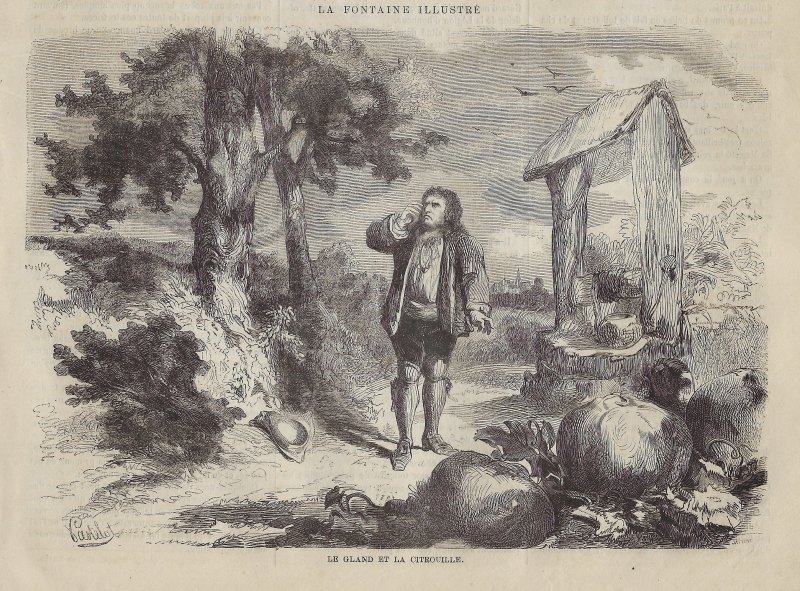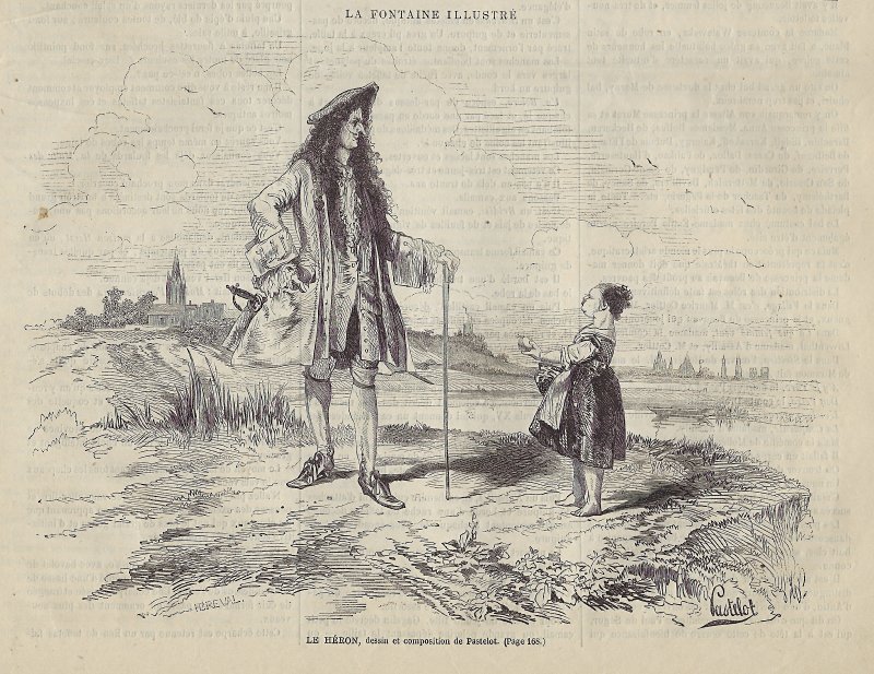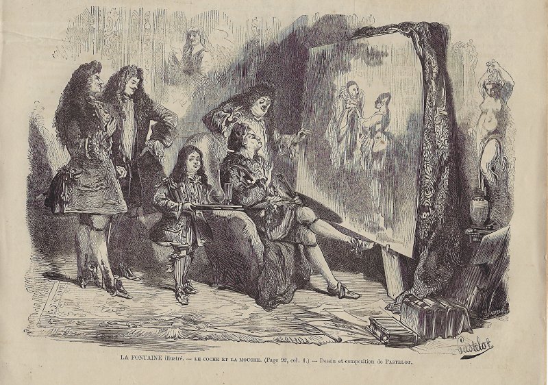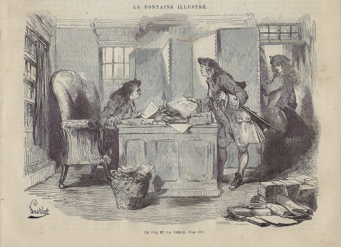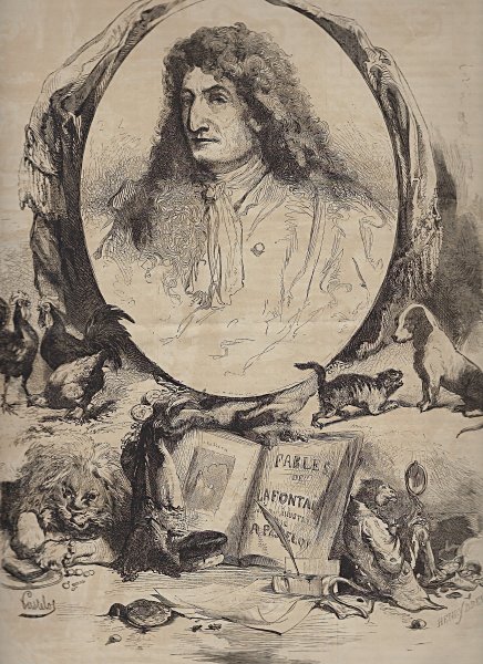 Perhaps beginning with this issue was a series on La Fontaine's fables. This issue contains a full-page illustration featuring a cameo bust of La Fontaine surrounded by characters from his fables, with a book of them in front of the large cameo (p. 769). The book's title-page mentions A. Pastelot, who did all the fable illustrations in this series. The engraver has a signature in the lower right of this engraving: Henry Breval(s). Before (p. 767) and after this engraving is a substantial essay on La Fontaine by Charles Vincent, especially his life. I presume that this essay is an introduction to the series. By contrast with the other issues we have, this number does not have a fable item on its first page.