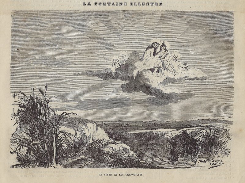 This issue's first page presents a half-page wood-engraving titled "Le Soleil et les Grenouilles." The second illustration is on 481, while the text of the fable is on 482. Both illustrations are striking. In the larger "human" translation on the first page, the son and his wife are humans, surrounded by six little sun-children with haloes. Frogs on the earth below are laid out belly-up as if dead. The smaller interior picture apparently shows Aesop explaining to a group that they should not celebrate their tyrant's wedding-day. This issue is twelve pages long. L'Illustrateur des Dames et Demoiselles: Journal des Soirées de Famille seems to have been known as a "Journal de Mode." It carried items of interest to women, particularly fashion. Its masthead presents the same engraving of women gathered around sewing, piano playing and singing, reading, and painting. Pages are three columns wide.